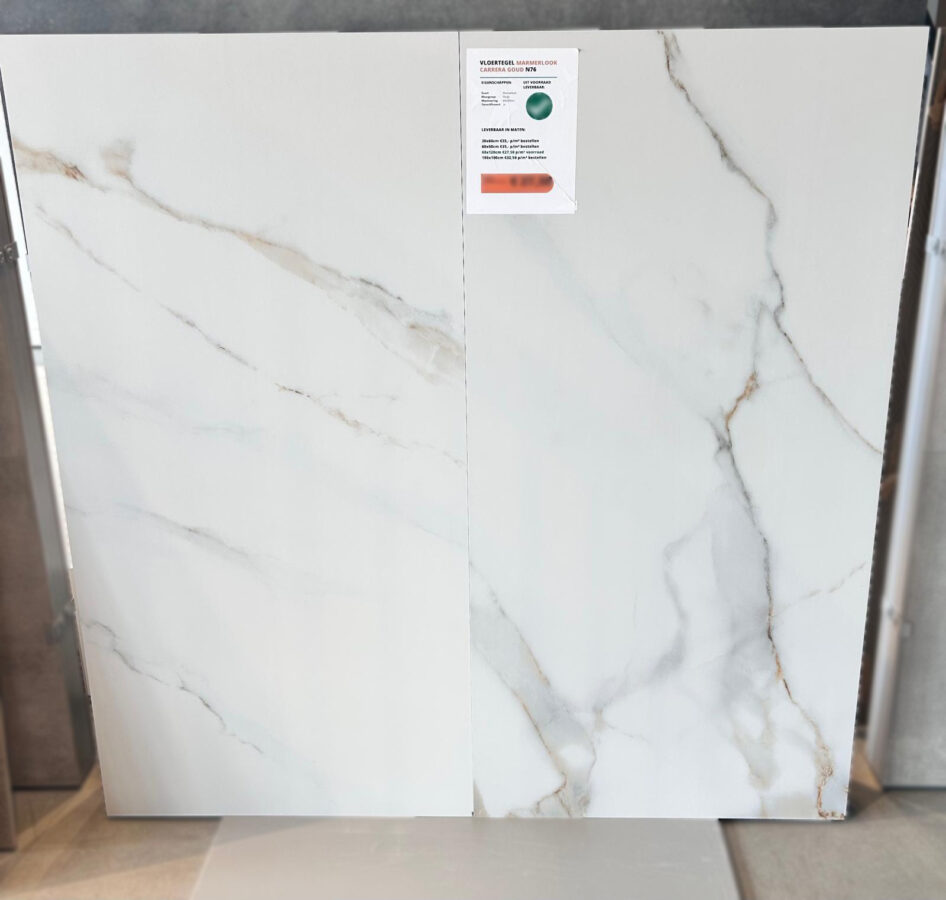 Marmerlook tegels 60×120 cm Carrera Goud Mat N76 zijn het perfecte alternatief voor liefhebbers van gouden marmeren vloeren. Het verschil is dat ze gemaakt zijn van keramisch, en niet de nadelen hebben van echt marmer.